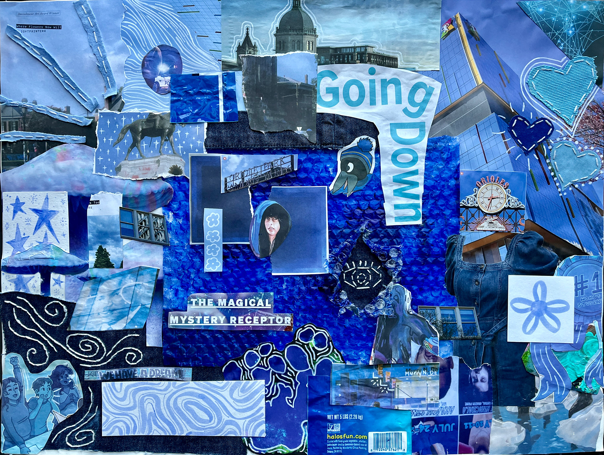 Bubble Wrap, Embroidery Thread, Fabric, Denim, Magazine Cut-Outs, Newspaper Cut-Outs, White Posca Pen