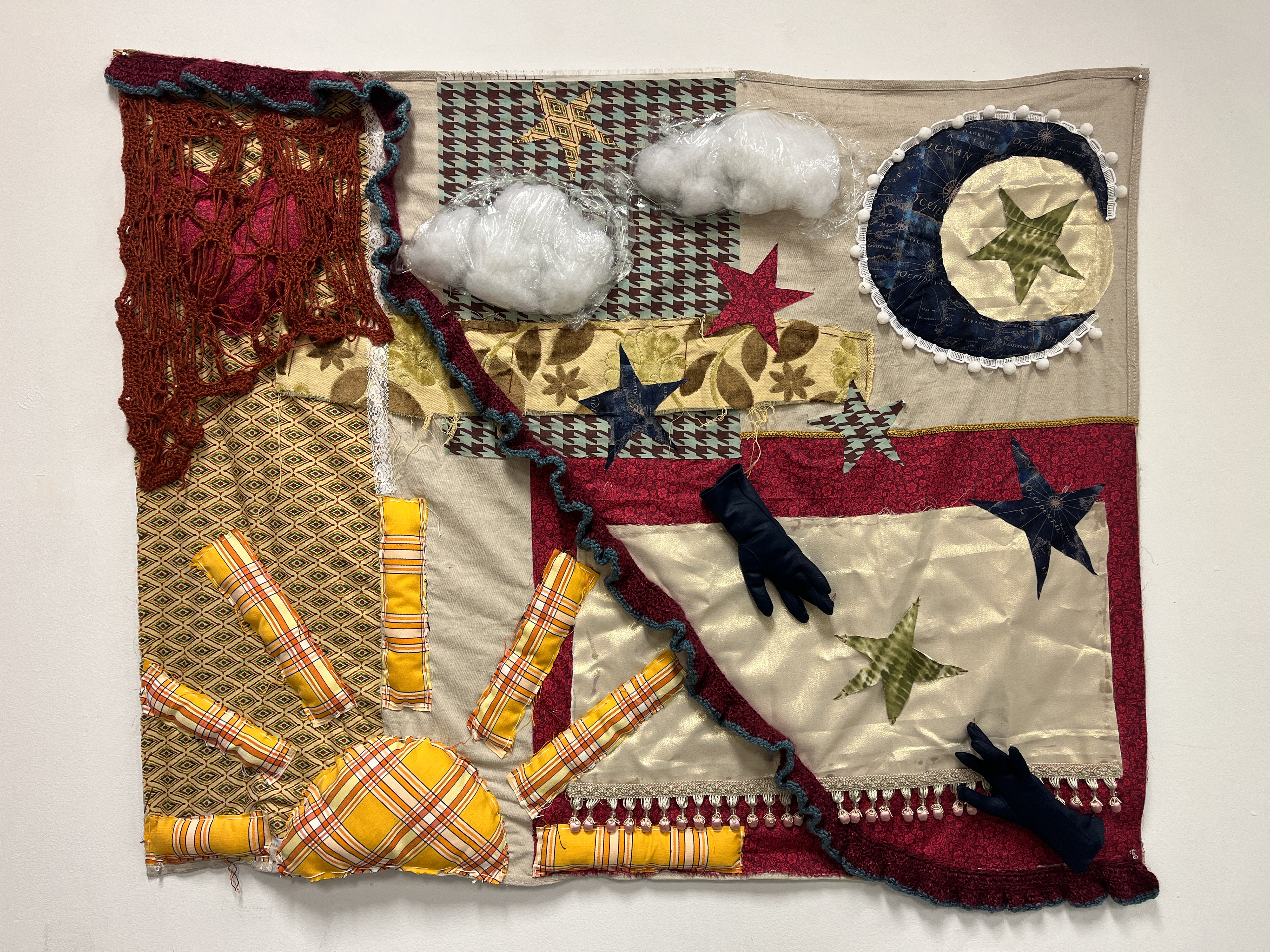 Canvas Drop Cloth, Mixed Fabrics, Stuffing, Crochet, Gloves, Ribbon, Embroidery Thread, Tassels, Saran Wrap