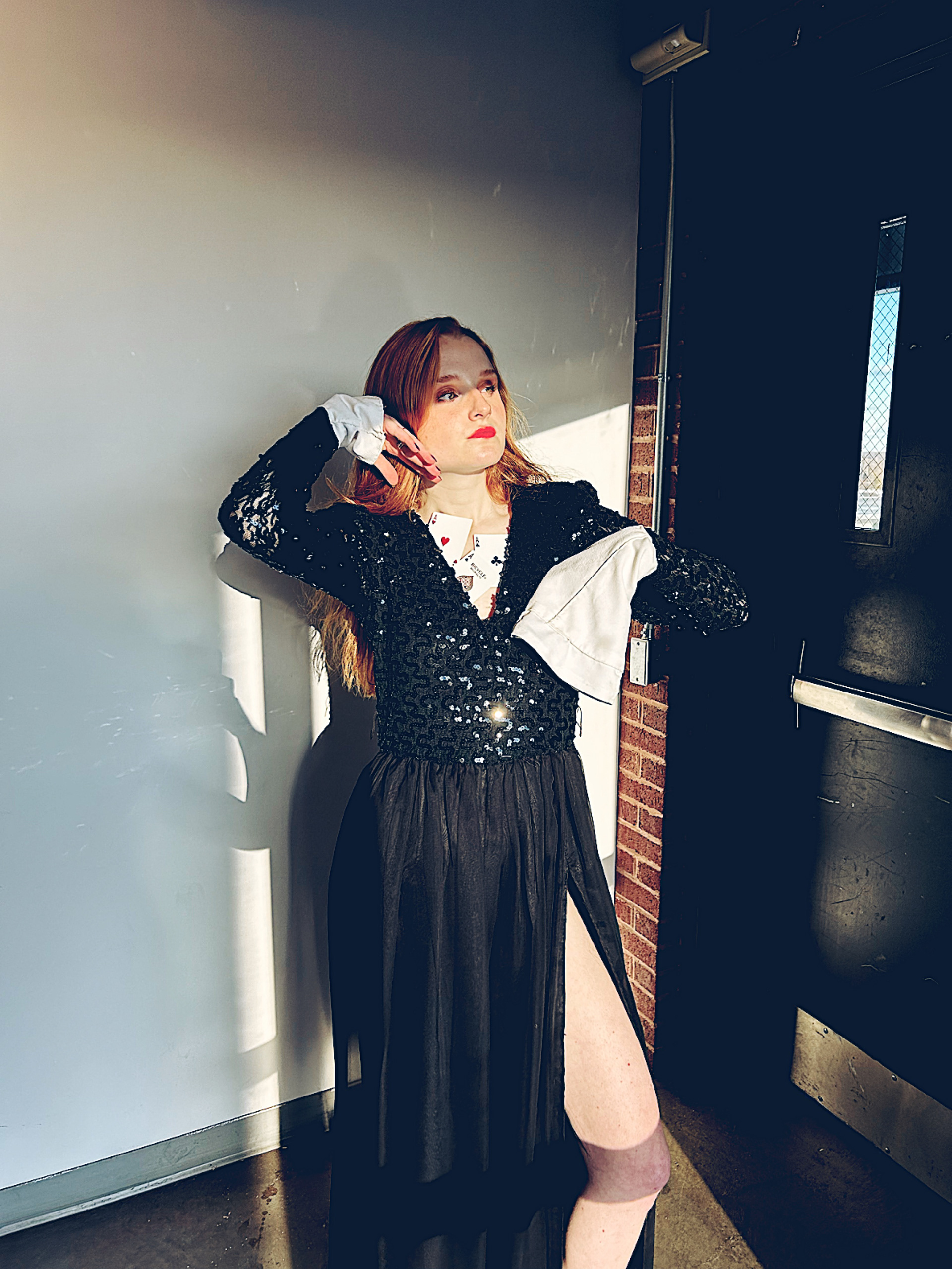 Vintage Jumpsuit Altered by Adding a V-Neckline, Leg Slit, and White Sleeves. Red Ace of Spades Painted Inside of Left Sleeve