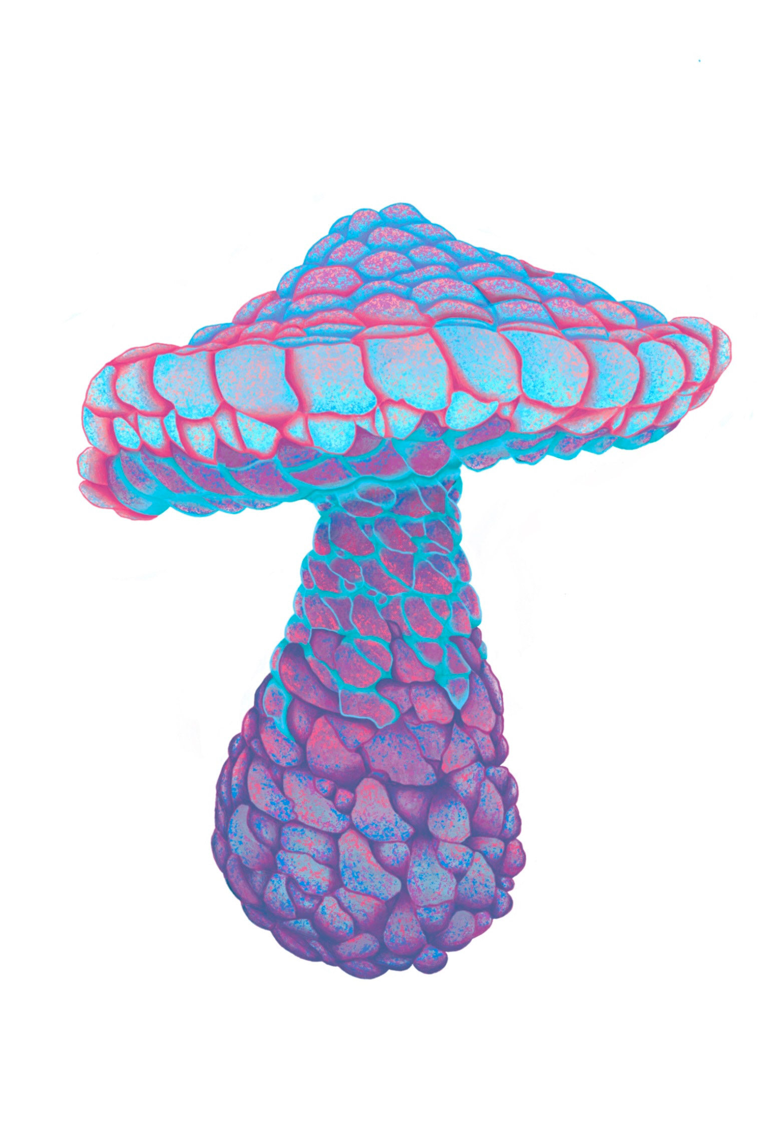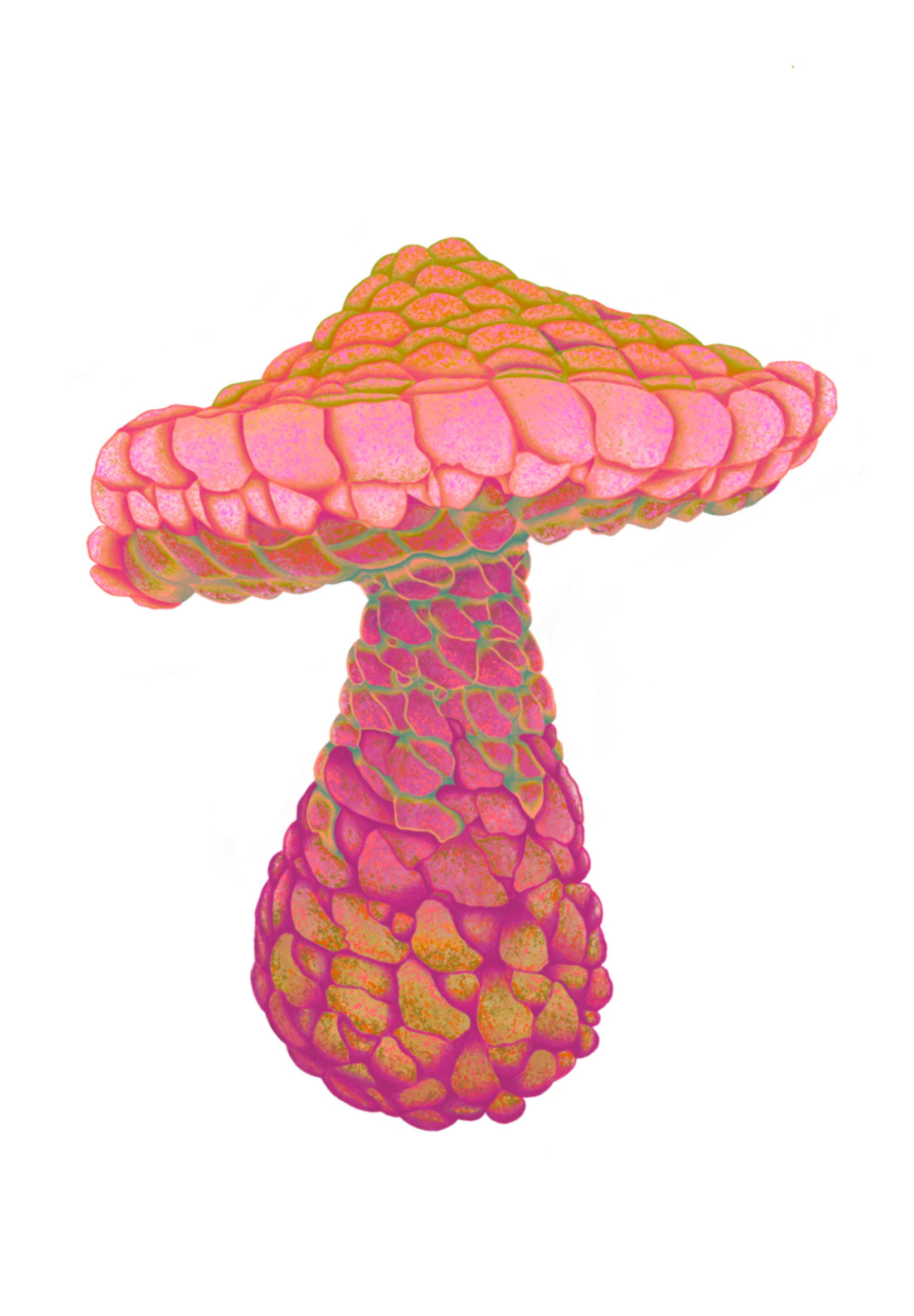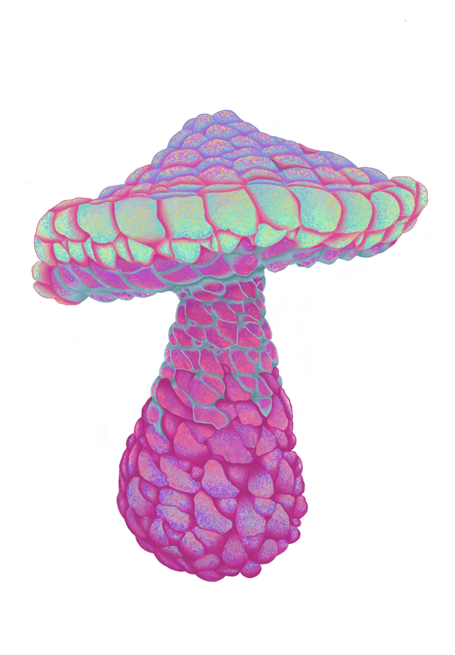 Procreate Drawing of a Crochet Mushroom in Four Different Colourways
