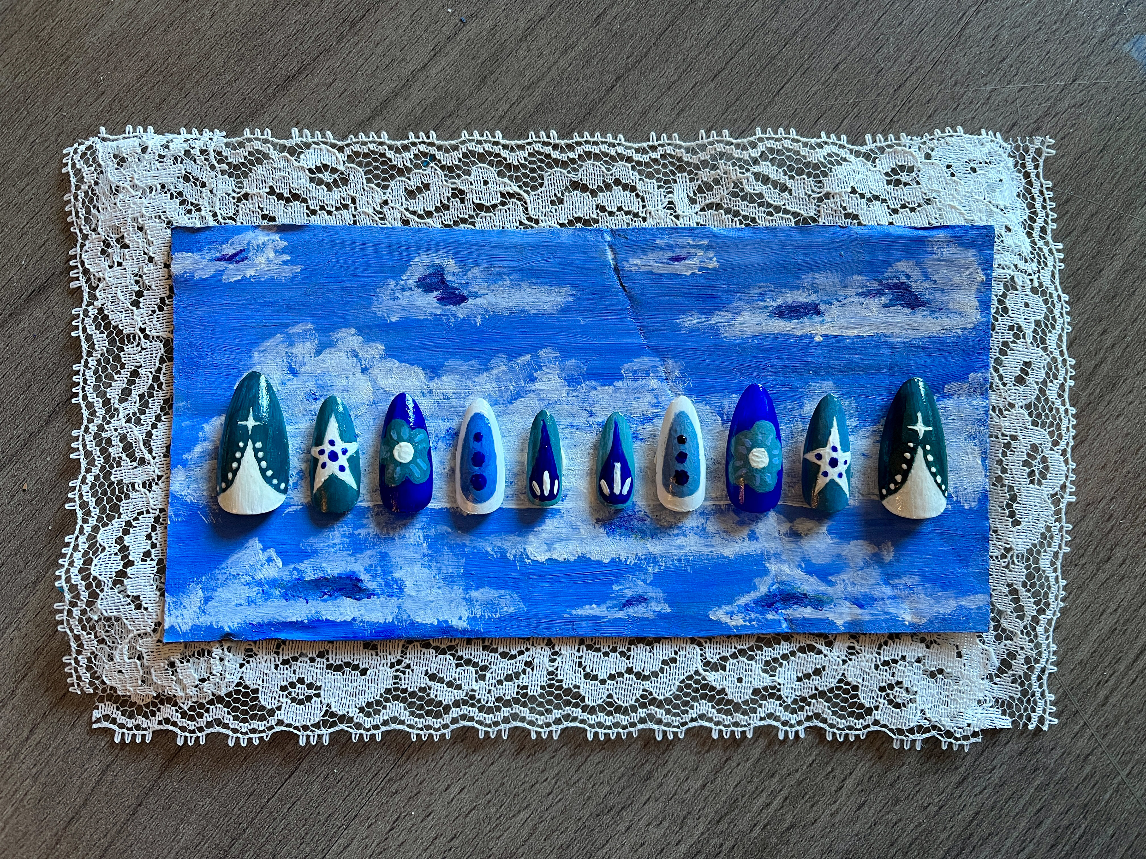 A Set of Press-On Nails Hand Painted Surrounding the Color Blue with